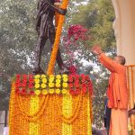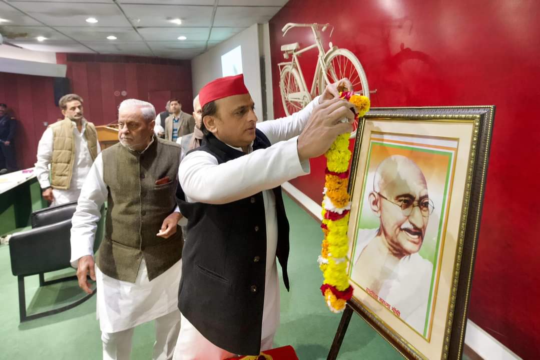 अखिलेश यादव ने गांधी जी के चित्र पर माल्यार्पण कर उन्हें श्रद्धांजलि अर्पित की