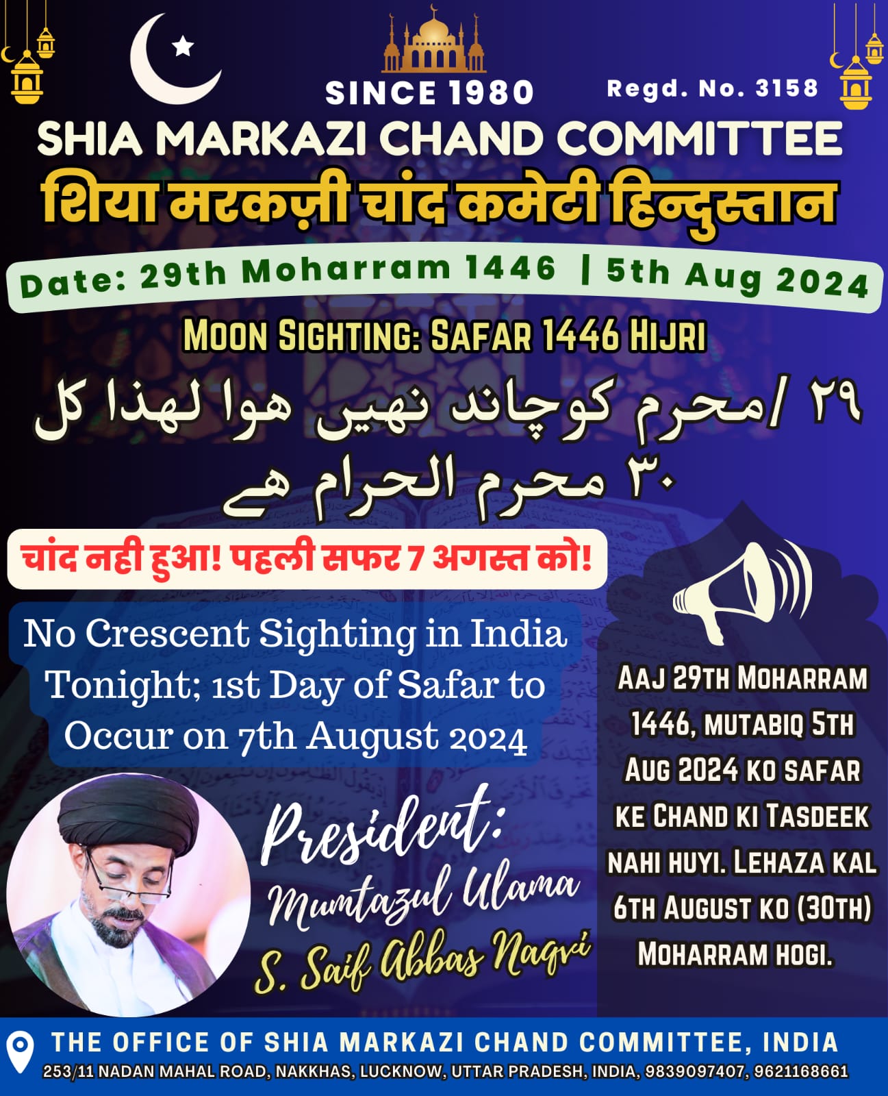 शिया चाँद कमेटी के अध्यक्ष मौलाना सैय्यद सैफ अब्बास नकवी ने सूचना दी है कि सफर का चाँद नही हुआ है। इसलिए 7 अगस्त 2024 को को पहली सफर है और 26 अगस्त 2024 चेहलुम शुहदाए अ0स0 करबला है