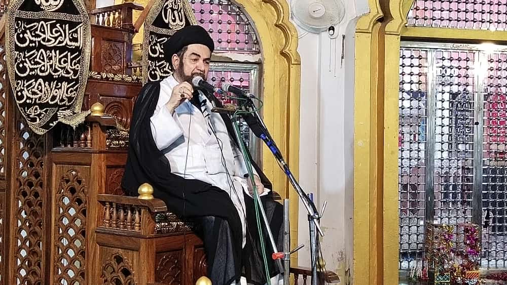 मौलाना ने कहा कि फरिश्तों में एक घुसपैठिया आगया था मुनाफ़िक़ आगया था न व सजदो से पहचाना गया न तौहीद से पहचाना गया जब सजदा करने का हुक्म हुआ तो अपने इंकार से पहचाना गया अल्लाह ने पूछा क्या तू अपने को आलीन में समझता था आलीन की तशरीह अहले सुन्नत के बड़े बड़े आलिमों ने अच्छे अंदाज़ में की है दुर्रे मंसूर में ज़बरदस्त तशरीह है कि आलीन का मतलब बुलंद मरतबा लोग जिनको रब ने सजदा न करने वालों में रखा था मौलाना ने कहा एक सहाबिए रसूल सईद खुदरी ने रसूले इस्लाम से पूछा या रसूल अल्लाह आलीन कौन हैं आपने फरमाया अव्वलना मुहम्मद आख़रना मुहम्मद अली और फ़ातिमा, मौलाना ने कहा फितरूस अर्श का मुजरिम अल्लाह का मुजरिम था तकब्बूर किया था उसने सोलाह हज़ार पर थे बस तकब्बूर में उसके पर अल्लाह ने ले लिए थे ईमाम हुसैन की पैदाइश के वक़्त फ़रिश्ते जोक़ दर जोक़ उतर रहे थे फितरूस ने पूछा क्या बात है तुम लोग कहाँ जा रहे हो बताया नबी के घर नवासा आया है मुबारकबाद देने जा रहा हूँ कहा हमें भी ले चलो फरिश्तों के साथ हो लिया और जब उसने हुसैन के झूले से खुद को मसख किया पहले से ज़ियादा ताक़तवर हो गया फिर उसने दोहराया मन मिसली पहले कहने पर अल्लाह ने मसल दिया अब उसने फिर दोहराया मन मिसली अब सज़ा दोगुनी हो जानी चाहिए थी लेकिन अब वो हुसैन का आज़ाद करदा है, मौलाना ने कहा दो तरह के मुजरिम होते हैं एक अल्लाह का दुसरे हुक़ुक़ुल इबाद का यह हुसैन का मोजिज़ा है कि हुसैन ने अल्लाह के मुजरिम को पहले ही दिन माफ़ कर दिया, मौलाना ने जनाबे हुर और उनके बेटे की शहादत के मसायब पढ़े कैसे हुर ने खुद हुसैन के क़दमों में रखा और फिर हुसैन के लिए लड़ते हुए शहीद हो गए आज़ादरों ने सहाबीए हुसैन को आँसू बहाकर पुरसा दिया मजलिस का आगाज़ तिलावाते क़ुरआन पाक से क़ारी मासूम ने किया।