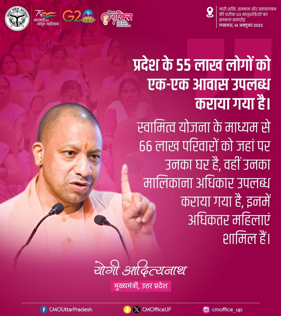 उत्तर प्रदेश के मुख्यमंत्री योगी आदित्यनाथ ने प्रदेश के 55 लाख लोगों को एक-एक आवास उपलब्ध कराया गया है। स्वामित्व योजना के माध्यम से 66 लाख परिवारों को जहां पर उनका घर है, वहीं उनका मालिकाना अधिकार उपलब्ध कराया गया है, इनमें अधिकतर महिलाएं शामिल हैं: