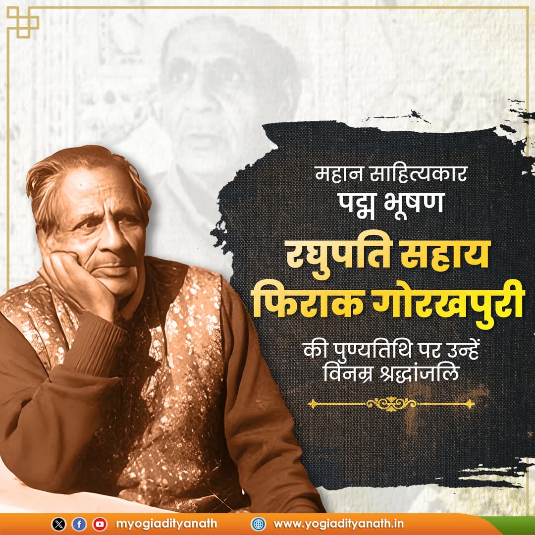 उर्दू के महान शायर फिराक गोरखपुरी’ की पुण्यतिथि पर मुख्यमंत्री योगी आदित्यनाथ ने विनम्र श्रद्धांजलि दी है