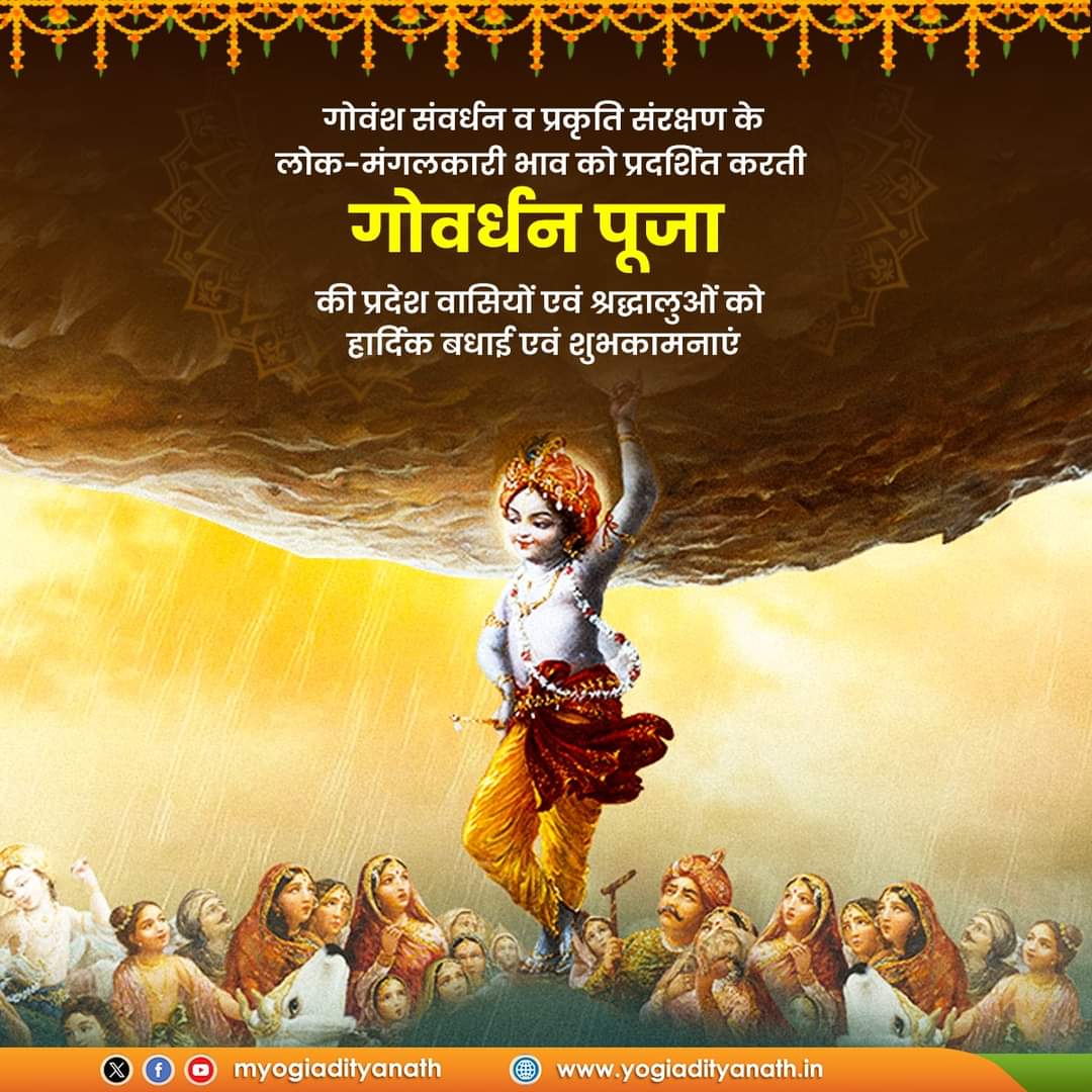 लखनऊ उत्तर प्रदेश के मुख्यमंत्री योगी आदित्यनाथ ने आज गोवंश संवर्धन व प्रकृति संरक्षण के लोक-मंगलकारी भाव को प्रदर्शित करती गोवर्धन पूजा की प्रदेश वासियों एवं श्रद्धालुओं को हार्दिक बधाई एवं शुभकामनाएं!
