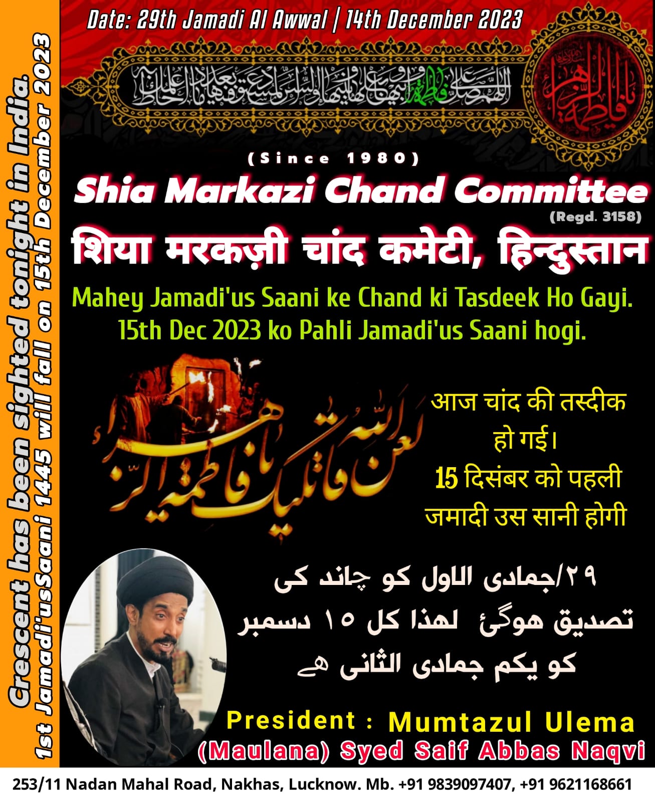 मरकज़ी शिया चाँद कमेटी के अध्यक्ष मौलाना सैय्यद सैफ अब्बास नकवी ने सूचना दी है कि 14 दिसम्बर 2023 को जमादि उस्सानी का चाँद हो गया है इसलिए 15 दिसम्बर 2023 को जमादि उस्सानी की पहली है और हजरत फातिमा स0अ0 की शहादत 17 दिसम्बर 2023 को है और विलादतेे हज़रत फातिमा स0अ0 03 जनवरी 2024 को है।