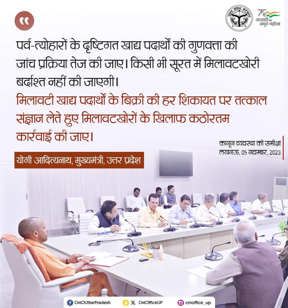 लखनऊ उत्तर प्रदेश के मुख्यमंत्री योगी आदित्यनाथ ने पर्व-त्योहारों के दृष्टिगत खाद्य पदार्थों की गुणवत्ता की जांच प्रक्रिया तेज की जाए। किसी भी सूरत में मिलावटखोरी बर्दाश्त नहीं की जाएगी।