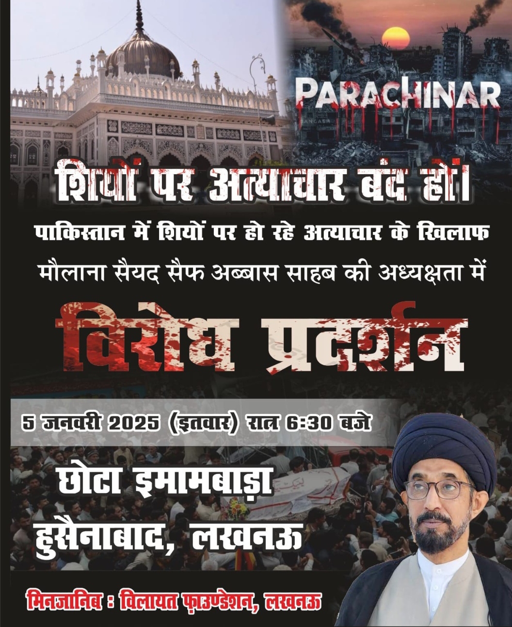 पाकिस्तान के पाराचिनार में शियाओं पर हो रहे अत्याचार के विरोध में लखनऊ में एक विरोध प्रदर्शन आयोजित किया गया है। मौलाना सैयद सैफ अब्बास नकवी ने पाकिस्तान सरकार की आलोचना की है, जो आतंकवादी संगठनों के सामने घुटने टेक रही है और शियाओं के नरसंहार पर तमाशाई बनी हुई है।