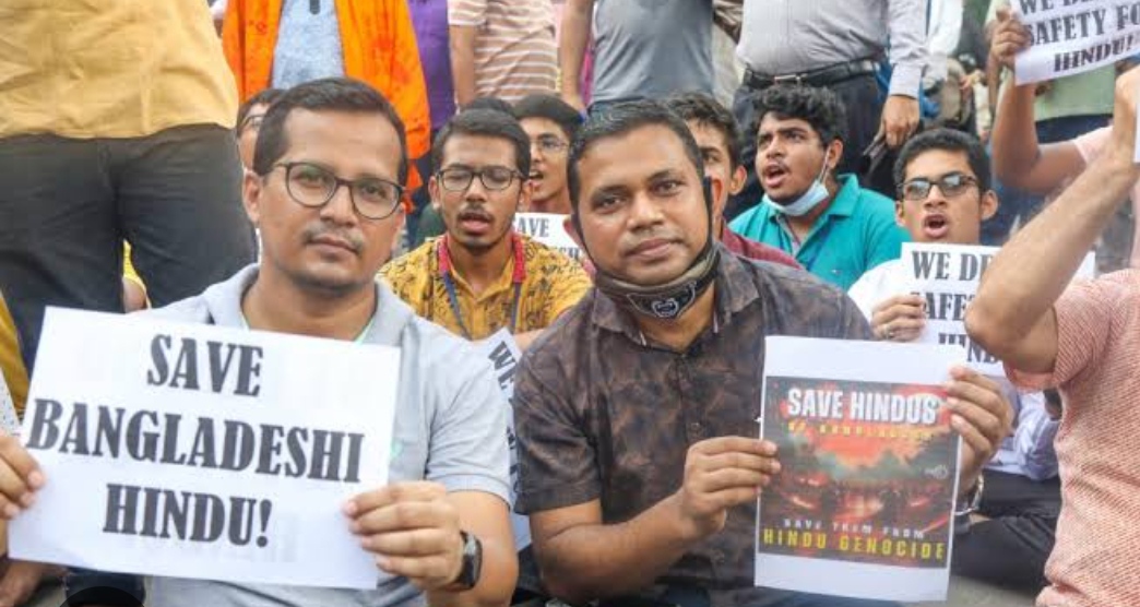 प्रदर्शनकारियों ने दावा किया कि पूर्व प्रधानमंत्री शेख हसीना की सरकार को हटाने के बाद बांग्लादेश में हिंदुओं पर अत्याचार हो रहे हैं ¹.