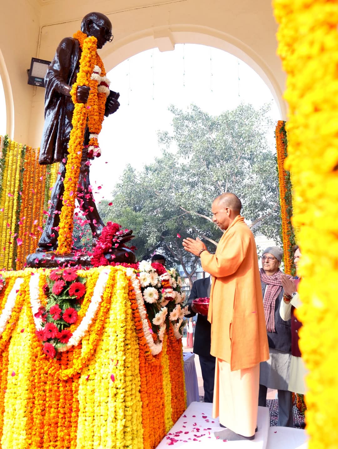 उत्तर प्रदेश के मुख्यमंत्री योगी आदित्यनाथ ने आज लखनऊ में महात्मा गांधी की पुण्यतिथि पर उन्हें श्रद्धांजलि दी। उन्होंने लखनऊ के जीपीओ स्थित गांधी प्रतिमा पर पुष्पांजलि अर्पित की और कहा कि महात्मा गांधी स्वाधीनता आंदोलन के महानायक और राष्ट्रपिता थे ¹। इस अवसर पर बच्चों ने महात्मा गांधी से जुड़े विभिन्न भजन गाकर उन्हें श्रद्धांजलि अर्पित की। सीएम योगी ने महात्मा गांधी की शिक्षाओं और उनके त्यागमय जीवन को विश्व शांति का मार्ग प्रशस्त करने वाला बताया ¹।