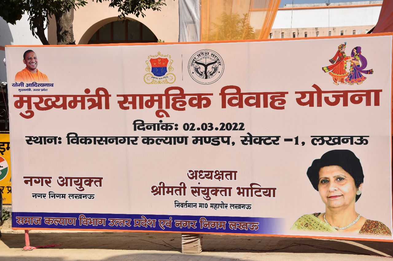 उ.प्र. सरकार की मुख्यमंत्री सामूहिक विवाह योजना*’ के अंतर्गत नगर निगम लखनऊ द्वारा समाज कल्याण विभाग के सहयोग एवं नगर आयुक्त श्री इन्द्रजीत सिंह के प्रयासो से सभी जाति व धर्म के 25 जोड़ो का विवाह पूर्ण विधि-विधान से सम्पन्न कराया गया। योजना के अंतर्गत नगर निगम लखनऊ के विकास नगर सेक्टर-1 स्थित पंडित दीन दयाल उपाध्याय कल्याण मण्डप में विवाह कार्यक्रम आयोजित किया गया। योजना में निर्धारित निर्देशो का अनुपालन करते हुए प्राप्त आवेदनों की जाँच कर विवाह योग्य 25 पात्र जोड़ो को चयनित किया गया था। योजना में अनुसूचित जाति के 23, पिछड़ी जाति के 1, सामान्य के 1 जोड़े का विवाह कराया गया। यह जोड़े विवाह हेतु अपने परिवारीजनो के साथ कार्यक्रम में सम्मिलित हुए।