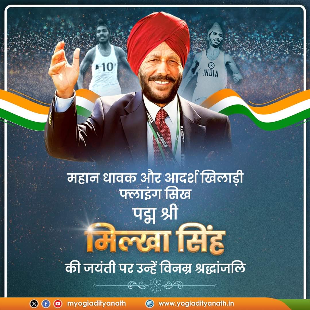 लखनऊ उत्तर प्रदेश के मुख्यमंत्री योगी आदित्यनाथ ने खेल जगत के ध्रुव तारे, वैश्विक पटल पर माँ भारती को अनेक बार गौरवभूषित करने वाले महान धावक, ‘फ्लाइंग सिख’ नाम से विख्यात, ‘पद्म श्री’ मिल्खा सिंह जी की जयंती पर उन्हें विनम्र श्रद्धांजलि!