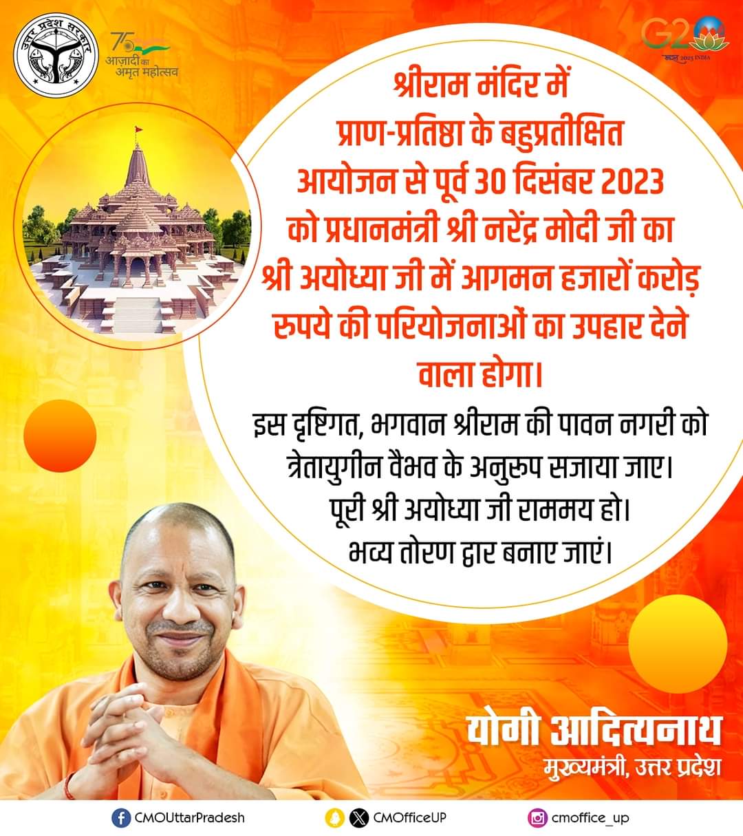 भव्य श्रीराम मंदिर में प्राण-प्रतिष्ठा के आयोजन से पूर्व आगामी 30 दिसंबर को प्रधानमंत्री जी का श्री अयोध्या जी में आगमन प्रस्तावित है। प्रधानमंत्री जी का यह भ्रमण श्री अयोध्या जी को हजारों करोड़ रुपये की परियोजनाओं का उपहार देने वाला होगा: