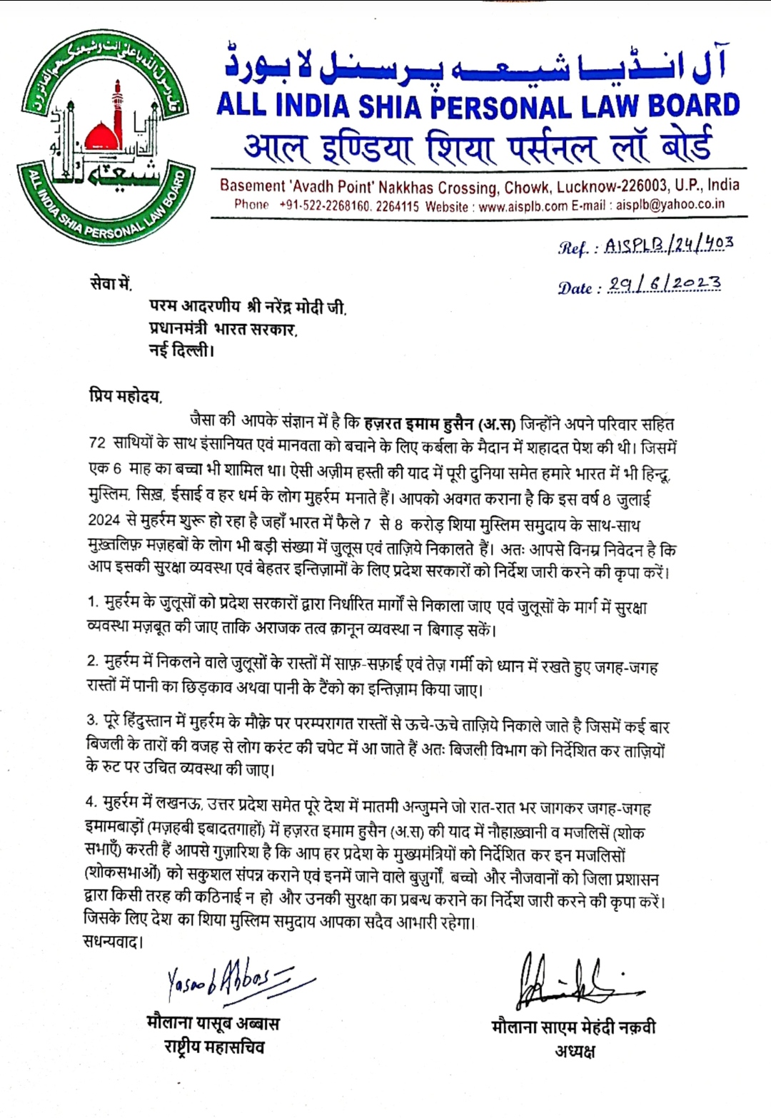 ऑल इंडिया शिया पर्सनल लॉ बोर्ड ने भारत के प्रधानमंत्री नरेंद्र मोदी जी को पत्र लिखकर आने वाले मोहर्रम में बेहतर इंतिज़ामात और उसमें पेश आने वाले शिया समुदाय के मसाएल पर बात कही है। बोर्ड ने पत्र में ल...