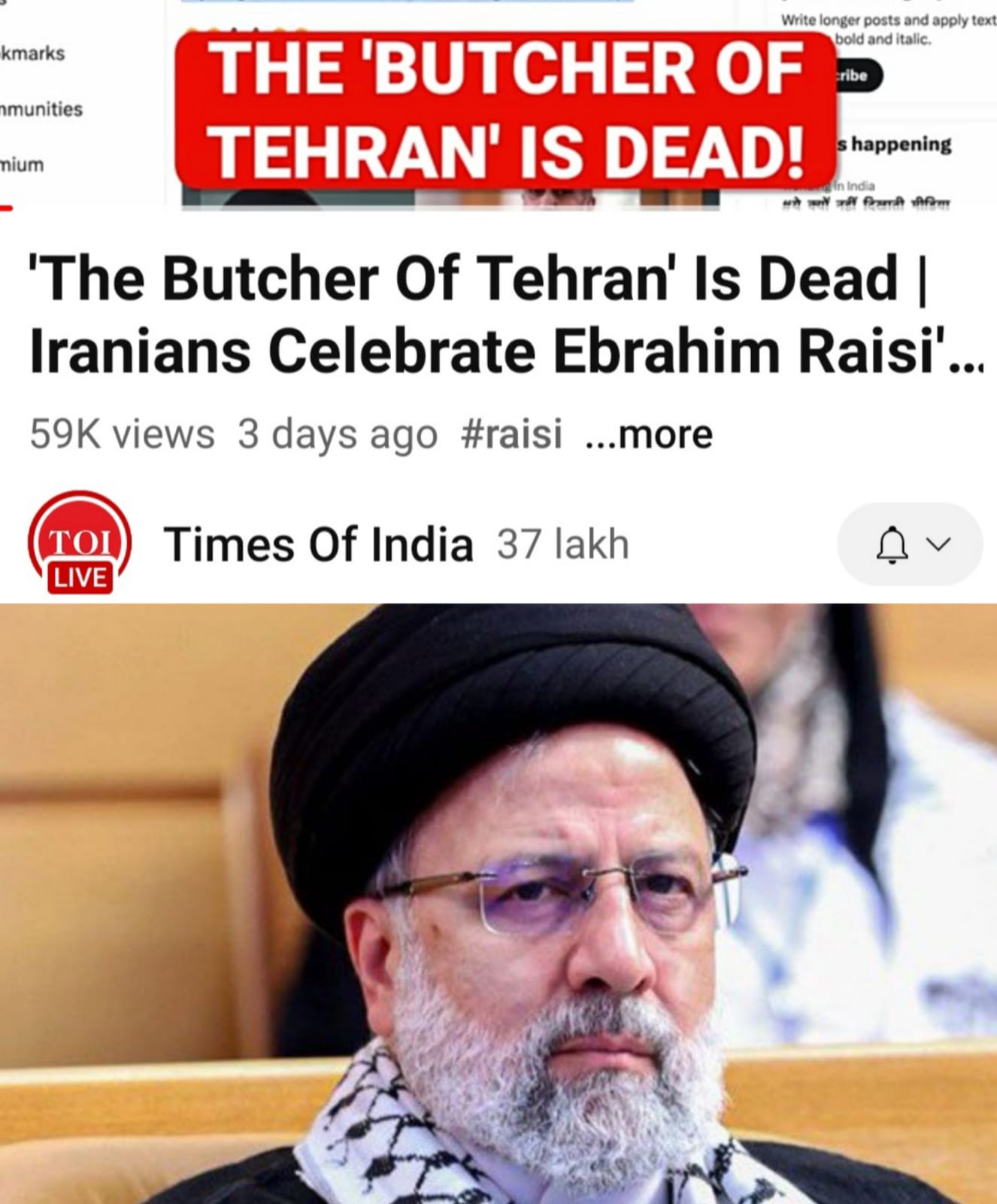 ईरान के राष्ट्रपति इब्राहिम रईसी की शहादत पर, Times of India Ke YouTube channel per The Butcher of Tehran is deadi caption mein likha gaya उनके लिए buchar/ कसाई शब्द के इस्तेमाल पर शिया क़ौम के नौजवानो...